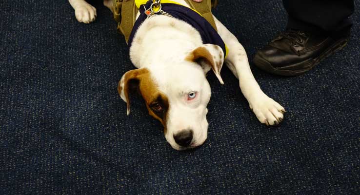 En un esfuerzo por aliviar la intimidación y la ansiedad, las víctimas de abuso infantil pueden testificar en una sala del tribunal con perros de terapia entrenados a su lado en el banquillo de los testigos. En 2019, el Senado aprobó la Ley de perros en los juzgados del Senador de Texas, John Cornyn, que permite que los perros de consuelo ingresen a la sala del tribunal para ayudar a los testigos a testificar si se encuentran afectados emocionalmente. La ley aclaró la autoridad de los jueces para permitir que animales de asistencia emocional entrenados y certificados ingresen a sus salas de audiencias.